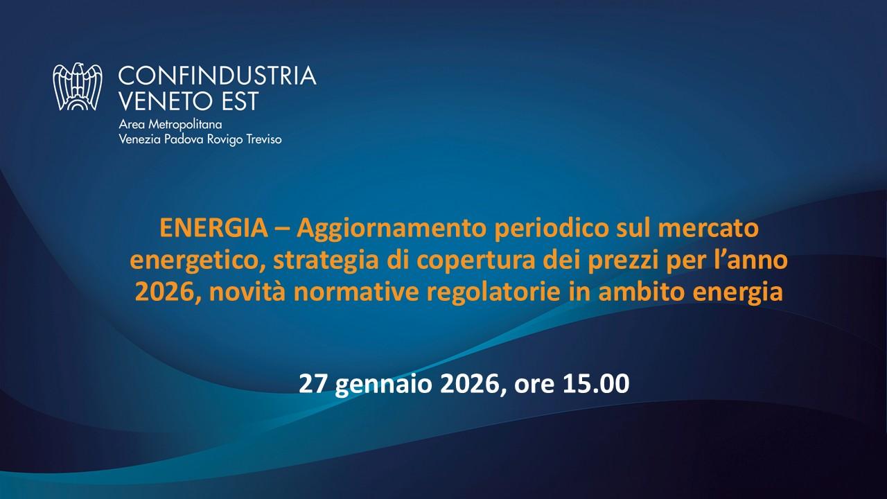 Energia - Seminario in videoconferenza su aggiornamento periodico sul mercato energetico, strategia di copertura dei prezzi per l'anno 2026, novità normative regolatorie in ambito energia - 27 gennaio 2026 ore 15.