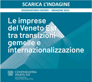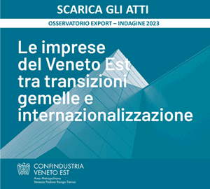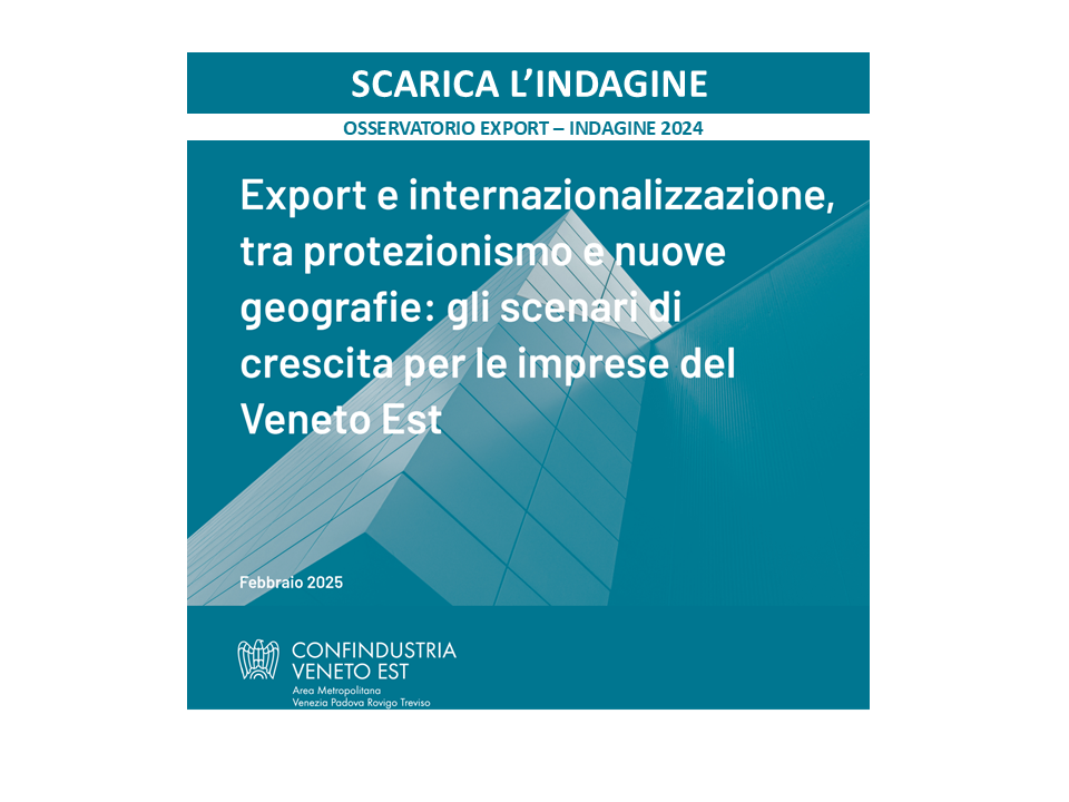 OSSERVATORIO EXPORT è un progetto di ricerca annuale realizzato dall’Area Affari Internazionali di Confindustria Veneto Est, in collaborazione con Fondazione Nord Est e SACE, su un campione rappresentativo di imprese manifatturiere. Lo studio coglie e interpreta i fenomeni in atto che determinano le strategie di internazionalizzazione delle aziende associate, i loro principali mercati di destinazione, le nuove opportunità per l’export e, più in generale, i fenomeni che interessano gli scambi commerciali e gli investimenti nei Paesi esteri.