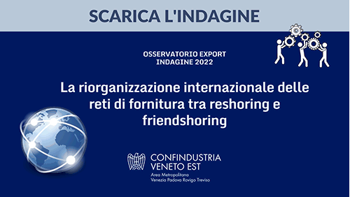 Le strategie di internazionalizzazione adottate dalle imprese, la riorganizzazione internazionale delle reti di fornitura, i Paesi target per il 2023 e l’utilizzo di servizi assicurativi e finanziari da parte delle imprese, sono i tre temi in cui si articola la seconda edizione dell’Osservatorio Export, condotto in collaborazione con SACE e Fondazione Nord Est, su un campione di oltre 650 imprese manifatturiere associate delle quattro province.