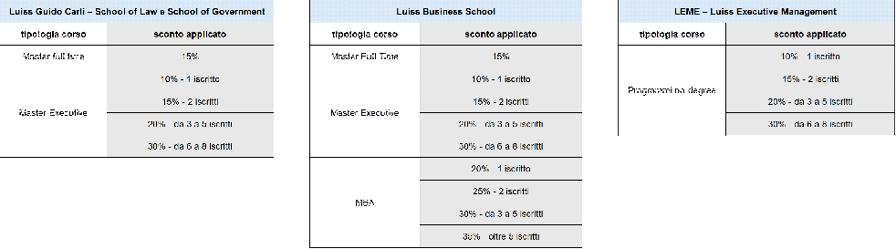 Per ogni ulteriore informazione è possibile contattare Gaia Di Martino gdimartino@luiss.it per la School of Government, a Giordano Otalli gotalli@luiss.it per la School of Law e a Sara Bedusa businessdevelopment@luissbusinessschool.it per Luiss Business School e LEME.