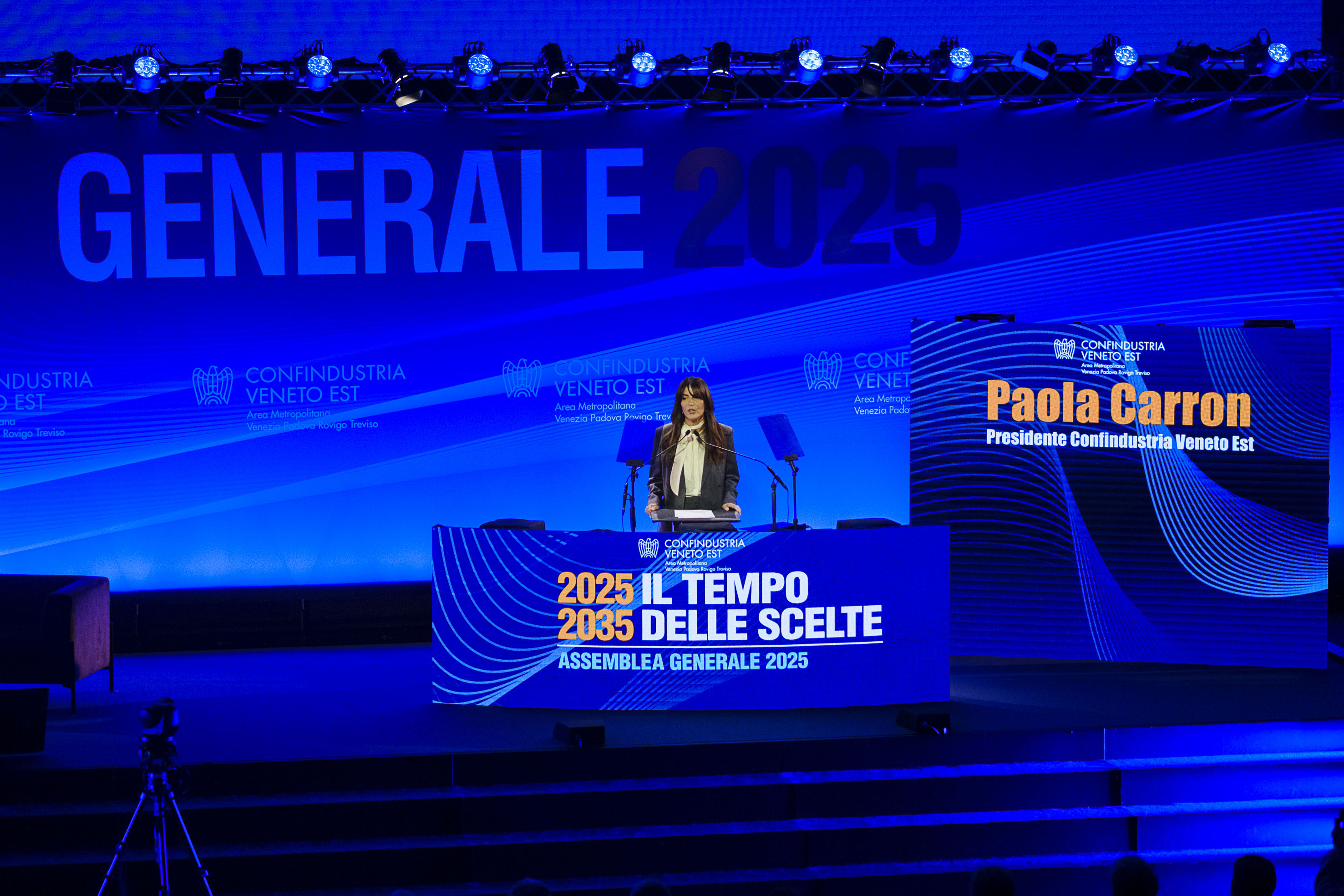 (Padova-Treviso-Venezia-Rovigo – 19.11.2025) – Si è tenuta oggi, al Centro Congressi della Fiera di Padova, l’Assemblea Generale 2025 di Confindustria Veneto Est, seconda territoriale del Sistema Confindustria, che rappresenta 5.119 imprese associate, quattro province – Venezia Padova Rovigo Treviso – e oltre 281.000 collaboratori. L’assise, dal titolo “2025-2035. Il tempo delle scelte”, ha registrato oltre 2.200 partecipanti.